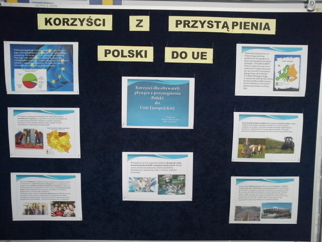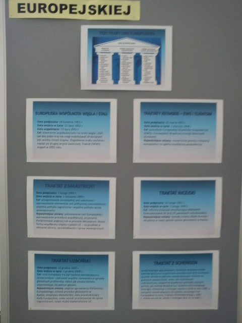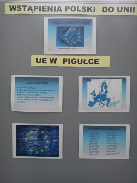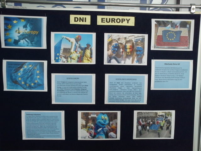 Jak co roku w naszej szkole zapraszamy całą społeczność szkolną do współudziału w obchodach kolejnej rocznicy wstąpienia Polski do Unii Europejskiej i Dnia Unii Europejskiej (9 V). Ogłosiliśmy konkurs dla wszystkich klas pt. „Jesteśmy Europejczykami”. Udział klas polegał na zrobieniu gazetki w klasie dotyczącej UE i wylosowanego państwa należącego do UE.