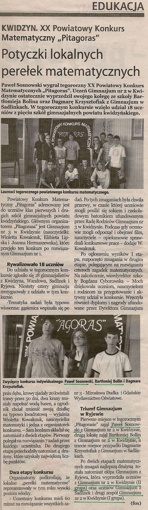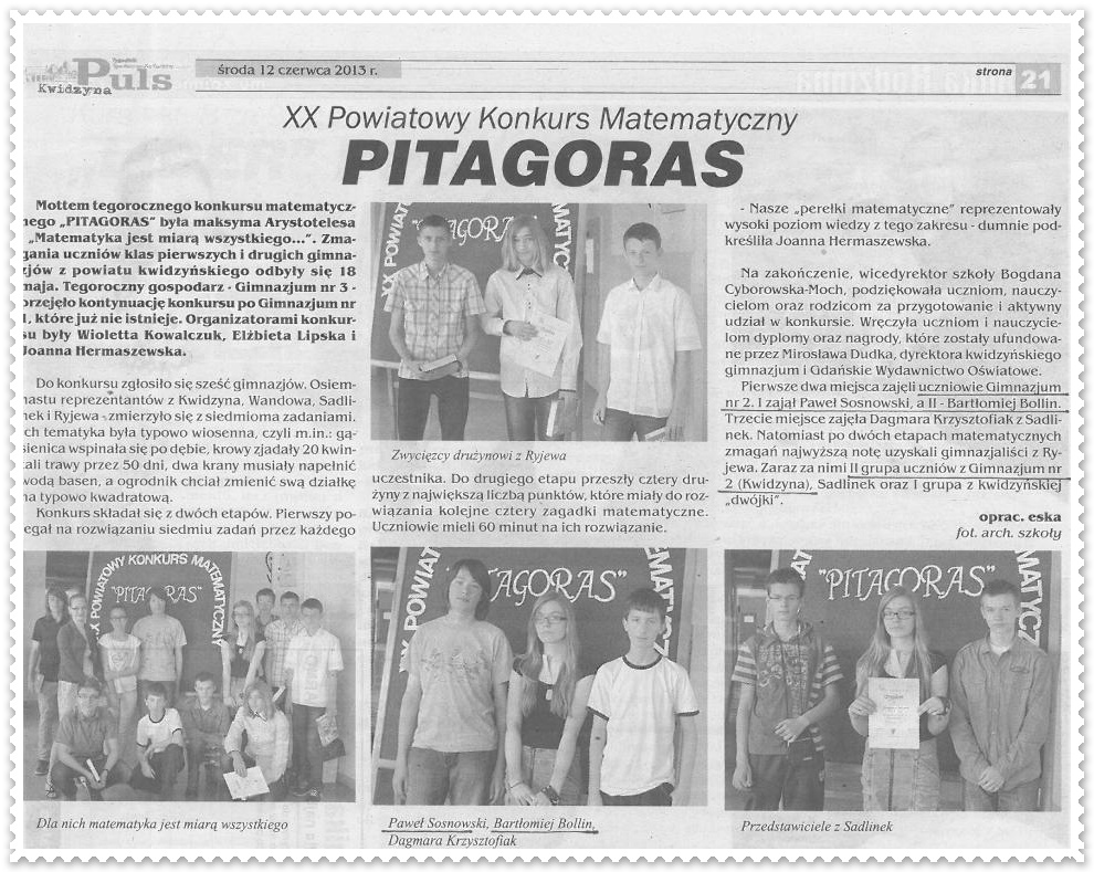Potyczki lokalnych perełek matematycznych - 22 maja 2013r. - Kurier Kwidzyński