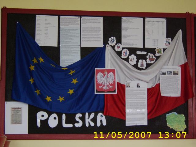 - W związku z tymi rocznicami zaprosiliśmy całą społeczność szkolną do współudziału w obchodach tych świąt pt. „Nasza mała Unia Europejska”. Udział klas polegał na wykonaniu gazetki i przystrojeniu klasy w barwy narodowe dowolnie wybranego kraju Unii Europejskiej. Celem konkursu było poszerzenie wiedzy na temat państw UE i ukazanie dorobku kulturowego tych państw. Rozstrzygnięcie konkursu nastąpiło 11 V 2007r. Wyniki wykonanych gazetek i dekoracji klas ukazujących wybrane państwo Unii Europejskiej