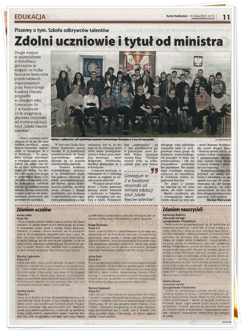Zdolni uczniowie i tytuł od ministra - 14 marca 2012r. Kurier Kwidzyński