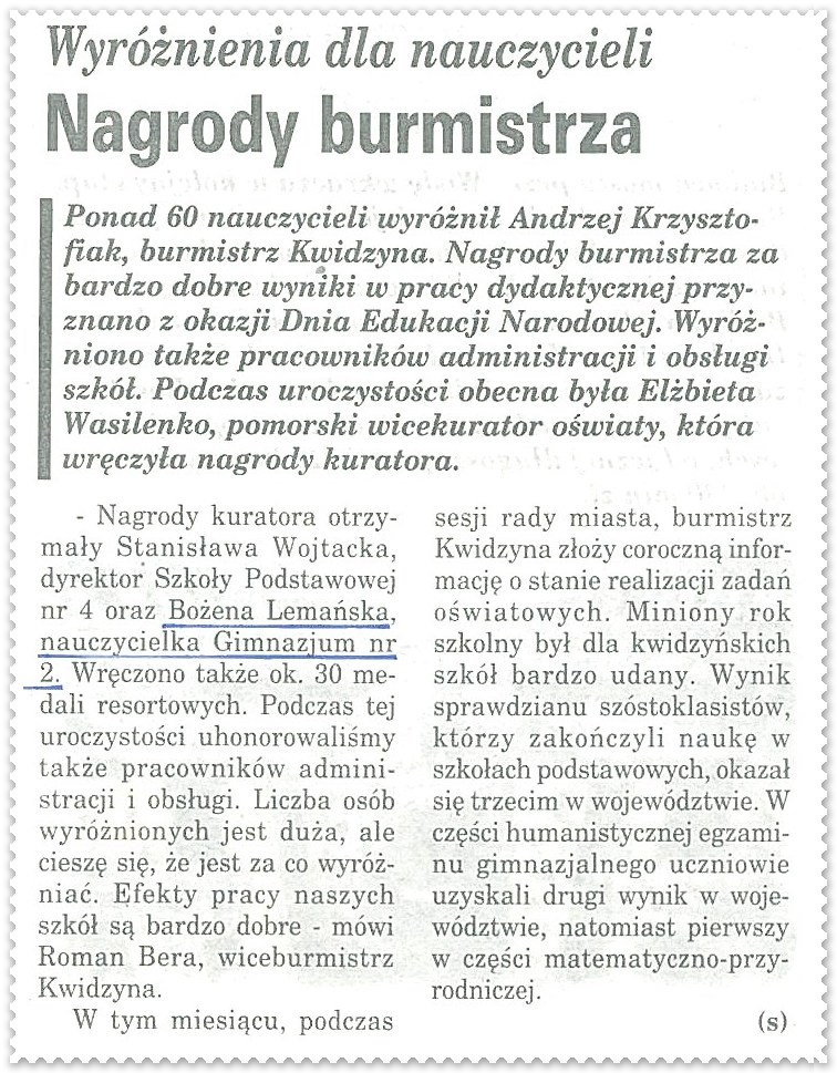 Wyróżnienia dla nauczycieli - 14 października 2011r. Kurier Powiatu Kwidzyńskiego