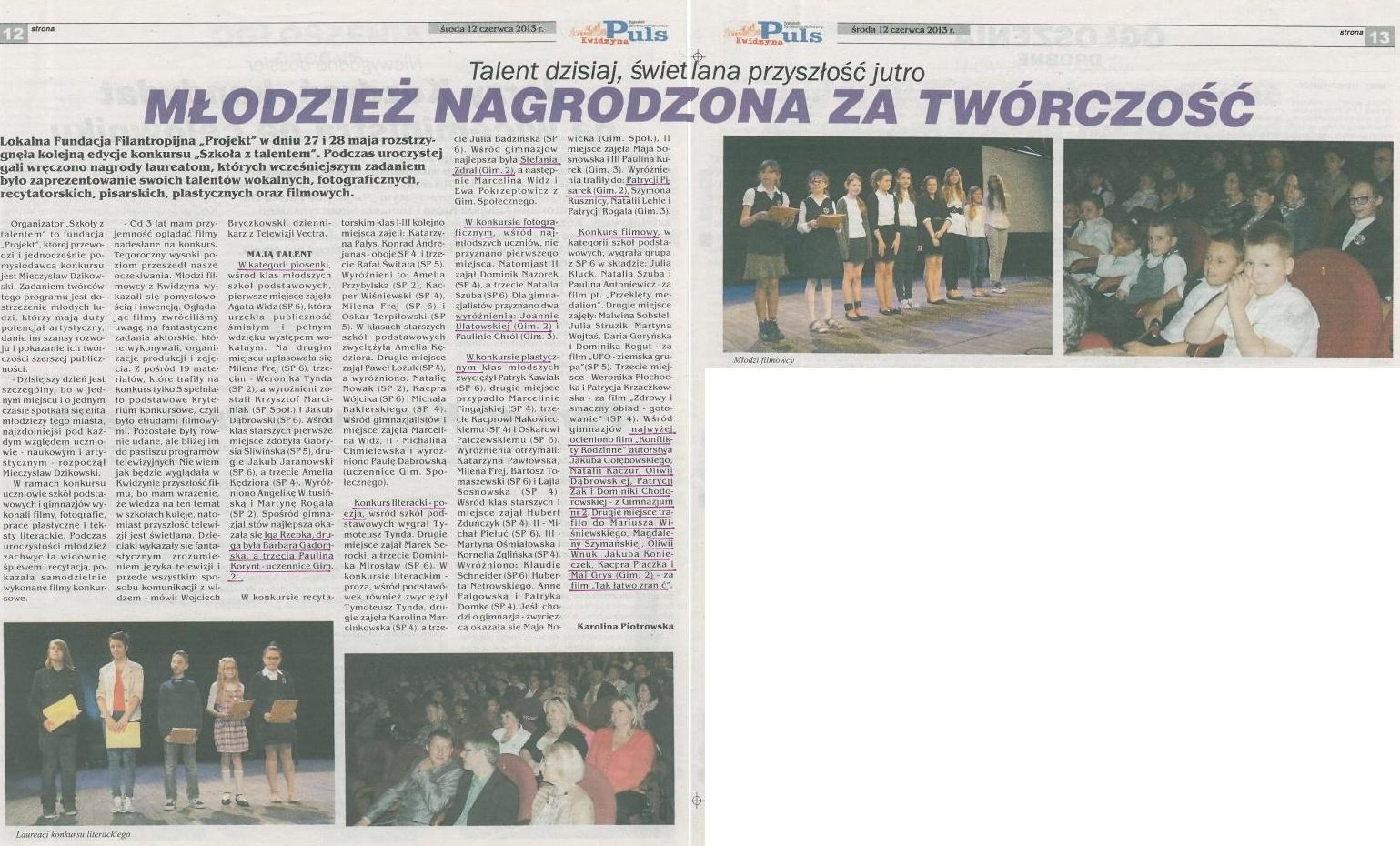 Młodzież nagrodzona za twórczość - 12 czerwca 2013r. - Puls Kwidzyna