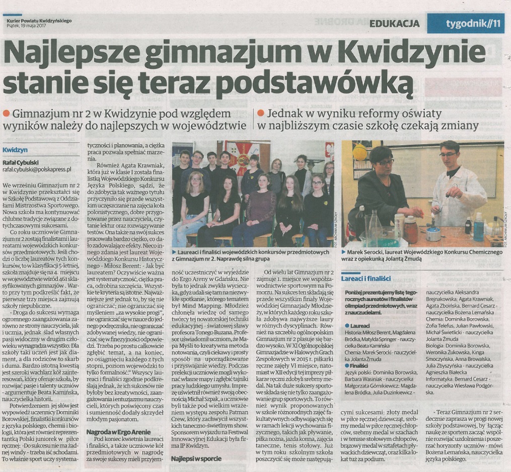 Najlepsze gimnazjum w Kwidzynie stanie się teraz podstawówką - 19 maja 2017r. - Kurier Powiatu Kwidzyńskiego