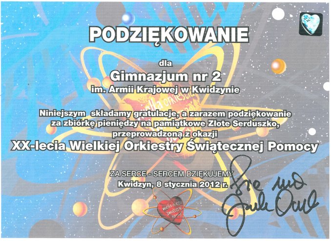 27 września 2011r. obchodziliśmy zaszczytny jubileusz – 10. rocznicę nadania Gimnazjum nr 2 imienia Armii Krajowej. To wydarzenie było dla nas szczególnie ważne, ponieważ kombatanci, zrzeszeni w Światowym Związku Żołnierzy AK- koło Kwidzyn z panem prezesem Stanisławem Sklepowiczem na czele, postanowili przekazać nam swój sztandar. Było to dla nas wielkie wyróżnienie, zaszczyt i honor oraz zobowiązanie, by tej rocznicy nadać wyjątkowy charakter. Uroczystości rozpoczęły się mszą świętą w Katedrze, którą koncelebrowali ks. kanonik Eugeniusz Najmowicz i ks. proboszcz Janusz Kilian, a wzięli w niej udział zaproszeni goście oraz społeczność szkolna. Dalsza część uroczystości odbyła się w Teatrze Miejskim, w którym ciekawe ekspozycje tematyczne przygotowała grupa nauczycieli pod kierunkiem p. A. Lasoty. W atmosferę święta wprowadził wszystkich poruszający spektakl przygotowany przez p. B. Lemańską, p.R.Bielawską-Kapicę i p.S.Wardaszkę z grupą naszych gimnazjalistów. Widzowie nie kryli łez i wzruszenia, które świadczyły o emocjach wywołanych treścią tego pięknego przedstawienia oraz o wrażliwości odbiorców. Następnie głos zabrała pani dyrektor Małgorzata Wróblewska i pan kapitan Stanisław Sklepowicz, który przekazał sztandar Armii Krajowej naszej szkole. Był to wyjątkowy moment, nacechowany podniosłością i powagą. W dalszej części uroczystości uczniowie klas I złożyli ślubowanie, które włącza ich w szeregi naszego gimnazjum Na zakończenie został wyświetlony film, który przedstawiał poruszające historie opowiedziane przez naszych kombatantów. Ta projekcja także wywołała wiele wzruszeń i emocji. Podsumowanie uroczystości stało się okazją do podziękowań, które skierowaliśmy do naszych ukochanych kombatantów, zaproszonych gości i sponsorów, wręczając wszystkim pamiątkowe tomiki poezji o AK , okolicznościowe prezentacje upamiętniające kolejne Święta Szkoły w latach 2001-2011 i kwiaty. Obchody 10. rocznicy nadania naszej szkole imienia Armii Krajowej były dobrą lekcją historii i patriotyzmu dla młodzieży gimnazjalnej. Tegoroczny jubileusz miał inną formułę w szkole. Najpierw uczniowie wraz z wychowawcami udali się na Skwer Kombatantów, by złożyć kwiaty i oddać hołd poległym. Po powrocie do szkoły zmierzyli się z zadaniami plastycznymi, sportowymi oraz przystąpili do „Biegu ku historii" . Odrobina zdrowej rywalizacji stworzyła ciekawy klimat do nieco mniej oficjalnego, ale równie emocjonującego Święta Szkoły.