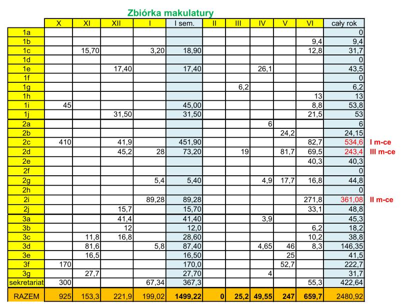 Akcja w szkole rozpoczęła się w połowie września. Na początku października po raz pierwszy oddaliśmy aż 925 kg makulatury. Na tak satysfakcjonujący wynik zapracowały klasy II c-410 kg, III F 170 kg, i kl. I h 45kg.