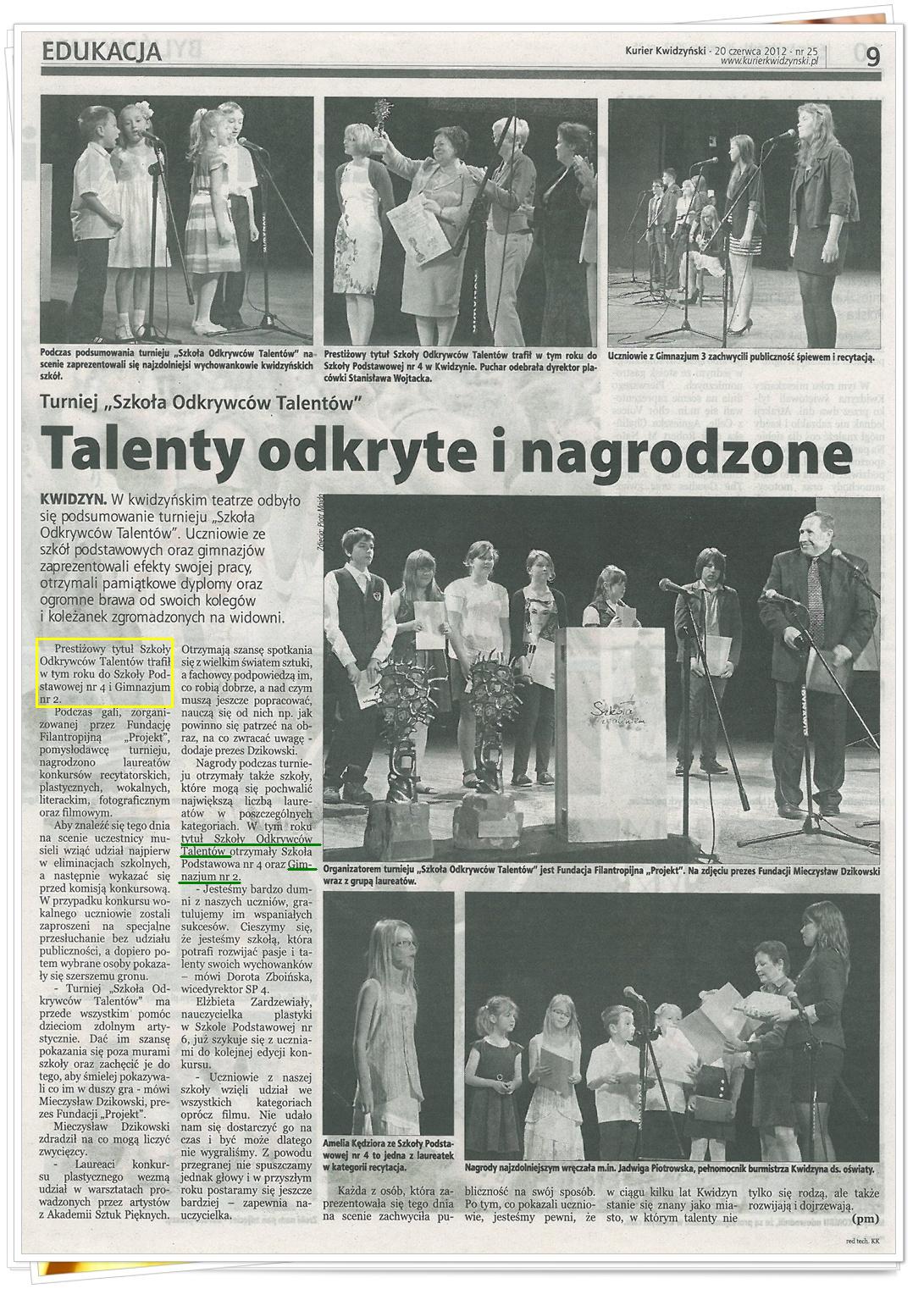 21 maja 2012 roku w Sali Polskiej Filharmonii Sinfonia Baltica w Słupsku rozstrzygnięty został XXVII Międzynarodowy Konkurs Literackiej Twórczości Dzieci i Młodzieży Gimnazjalnej. W jury konkursu zasiedli poeci, pisarze, dziennikarze, krytycy literaccy, pracownicy naukowi Uniwersytetu Warszawskiego, Akademii Pomorskiej w Słupsku i nauczyciele poloniści. Przewodniczącą tego szacownego gremium od wielu lat jest znana poetka Wanda Chotomska, według której słupski konkurs to największa w kraju impreza kulturalna poświęcona młodym talentom literackim, promująca dziecięcą i młodzieżową twórczość. W tym roku na konkurs nadesłano 9321 zestawów tekstów literackich z 402 szkół podstawowych i gimnazjów z całej Polski oraz 421 wierszy i opowiadań młodzieży polonijnej z 36 szkół w Stanach Zjednoczonych i 112 utworów literackich z 3 szkół w Berlinie. Tym bardziej miło nam poinformować, że dwie uczennice z naszego gimnazjum zostały nagrodzone w tym konkursie. Laureatką została Kamila Walas z klasy IIIc, zaś wyróżnienie zdobyła Zuzanna Gajko z klasy Ii.