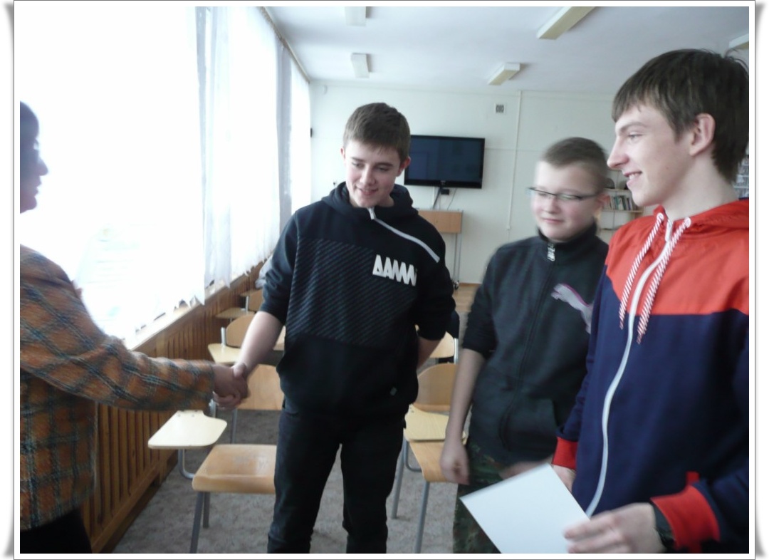 Dnia 19 marca 2013r. odbył się etap miejski Ogólnopolskiego Turnieju Bezpieczeństwa W Ruchu Drogowym. Do etapu przystąpiły dwa gimnazja: Gimnazjum nr 2 i Gimnazjum nr 3 w Kwidzynie. Drużyna z Gimnazjum nr 2 w składzie: Nikolas Dąbrowski, Radosław Grudziecki i Maurycy Witkowski, zakwalifikowała się do etapu powiatowego. Gratulujemy!!! |