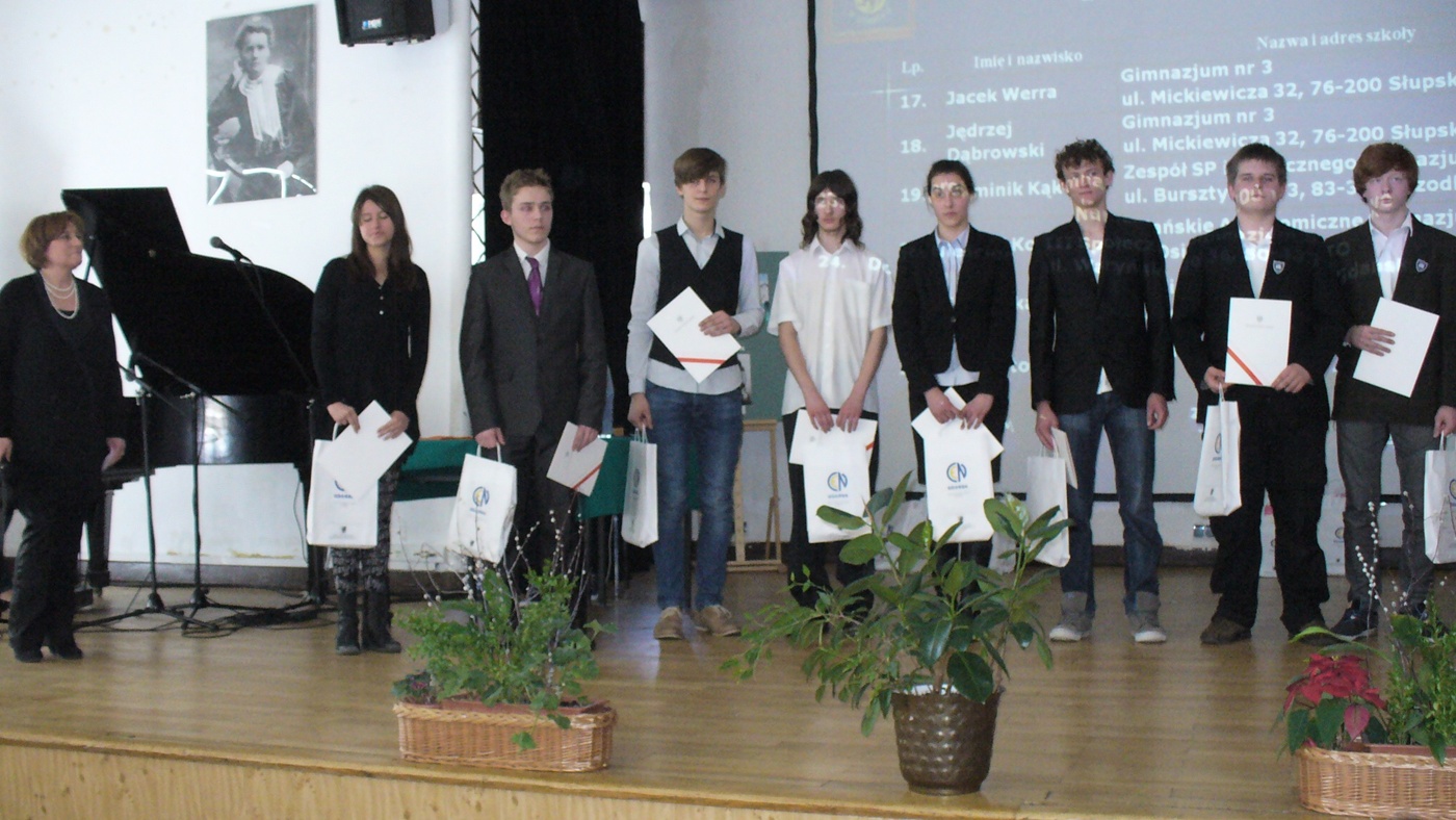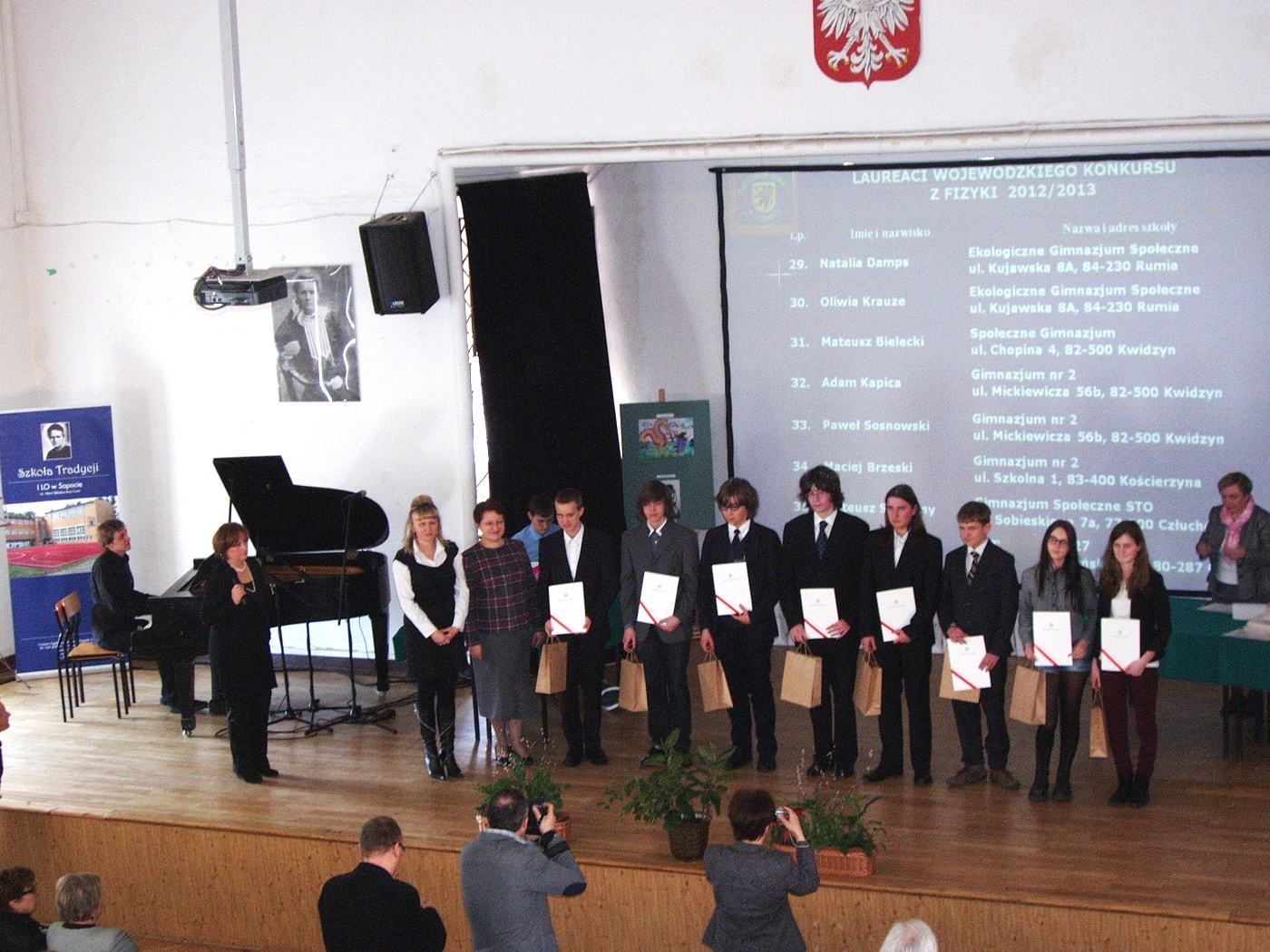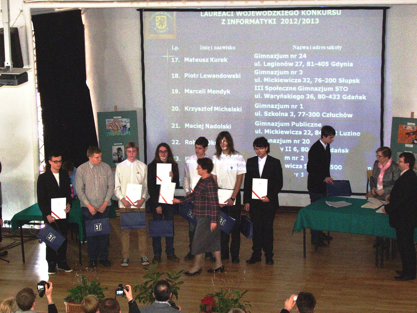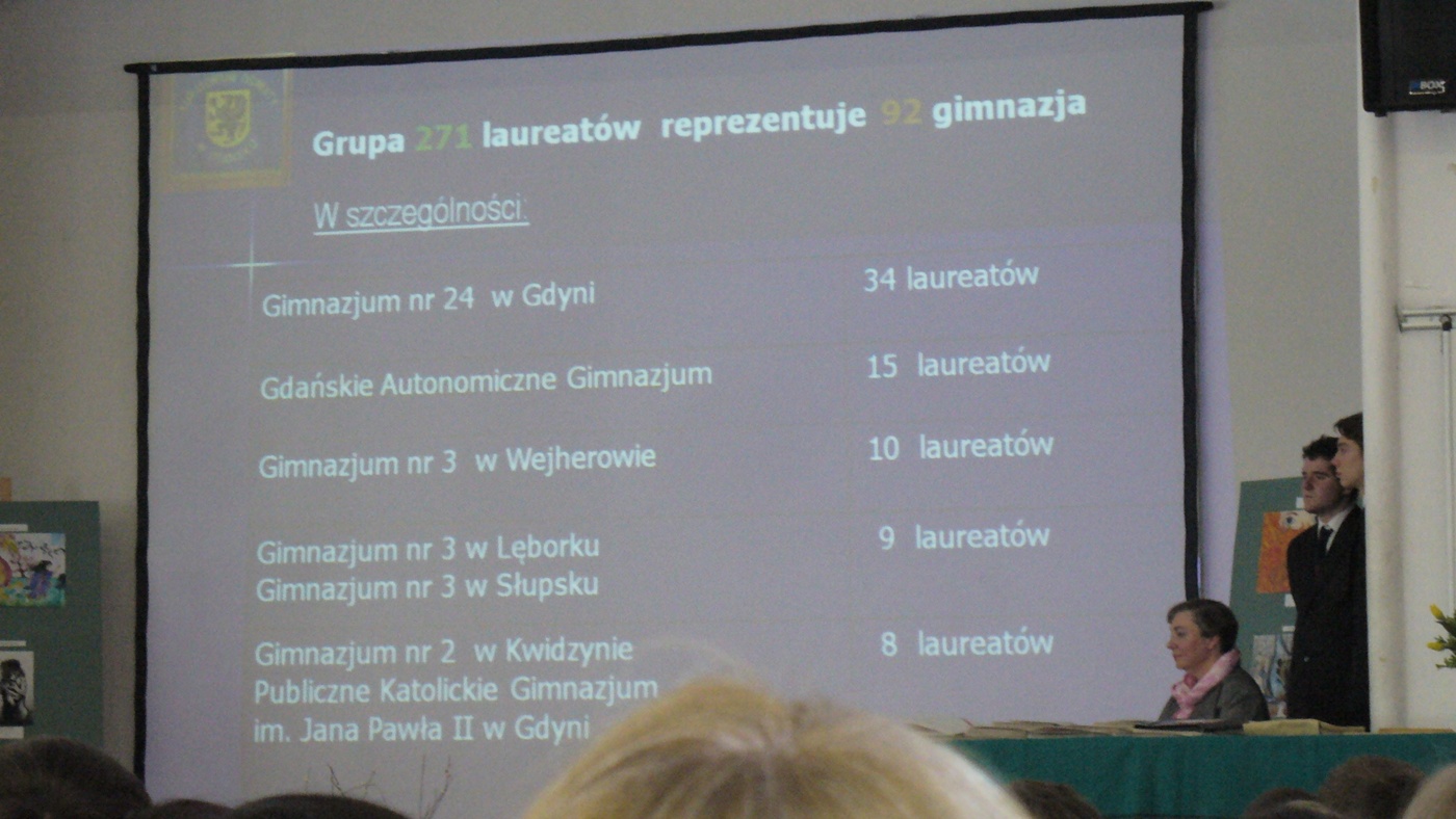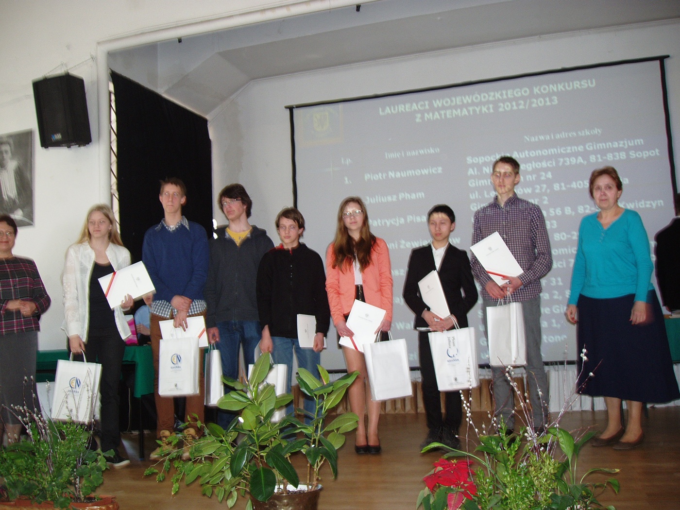 9 kwietnia 2013 roku w Zespole Szkół Nr 1 w Sopocie odbyła się uroczystość wręczenia zaświadczeń laureatom Wojewódzkich Konkursów Przedmiotowych organizowanych przez Pomorskiego Kuratora Oświaty. Najzdolniejsi w województwie uczniowie otrzymali swoje cenne zaświadczenia z rąk Pomorskiego Wicekuratora Oświaty pani Elżbiety Wasilenko, która w swoim przemówieniu pogratulowała sukcesów gimnazjalistom, ale również z wielkim uznaniem wyraziła się o nauczycielach zdolnej młodzieży, którzy potrafili dostrzec uczniowskie talenty i wydobyć z nich to, co najwartościowsze. Nasze gimnazjum w bieżącym roku szkolnym uzyskało 8 tytułów laureata. To powód do dumy i zadowolenia. Uwzględniając liczbę laureatów, po raz kolejny znaleźliśmy się w gronie najlepszych szkół w województwie pomorskim, zajmując w tej klasyfikacji zaszczytne V miejsce. Wszystkim laureatom serdecznie gratulujemy!