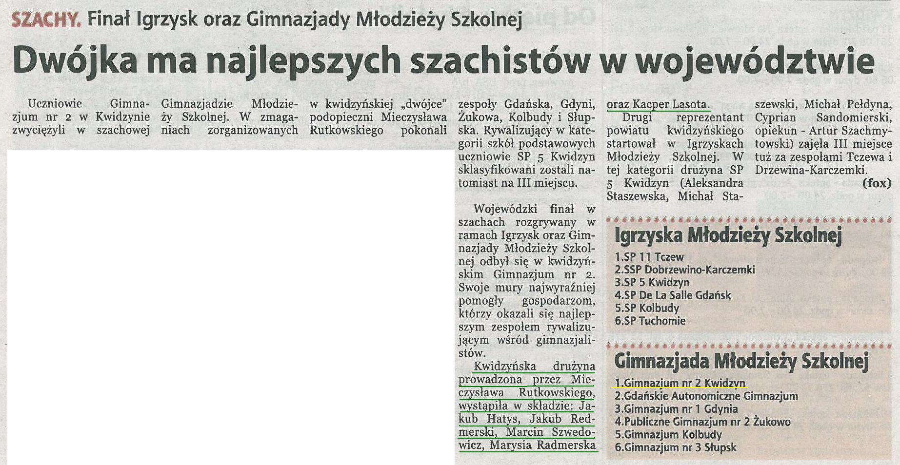Dnia 26 października 2012r. odbyły się Finały Wojewódzkiej Gimnazjady w szachach. Naszą szkołę reprezentowali: Jakub Redmerski, Maria Redmerska, Marcin Szwedowski, Kacper Lasota oraz Jakub Chatys. To oni wygrali i zdobyli złoty medal. Więcej.... GRATULUJEMY!! |