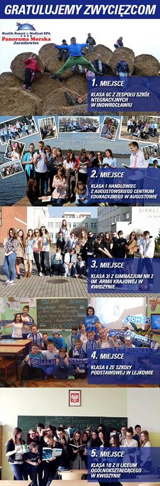 26 kwietnia 2014 r. ogłoszone zostały wyniki ogólnopolskiego konkursu fotograficznego pt. „Przebojowa klasa 2013/2014”. Zadanie konkursowe polegało na wykonaniu klasowego zdjęcia nawiązującego do hasła konkursu. Miło nam ogłosić, że klasa III i, której wychowawcą jest pani Bożena Lemańska, zajęła w tych zmaganiach III miejsce. Warto również wspomnieć, że nagrodą w konkursie jest bezpłatna wejściówka dla całej klasy do Aquaparku Panorama Morska w Jarosławcu.