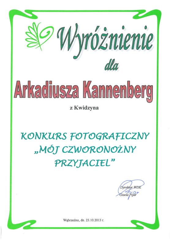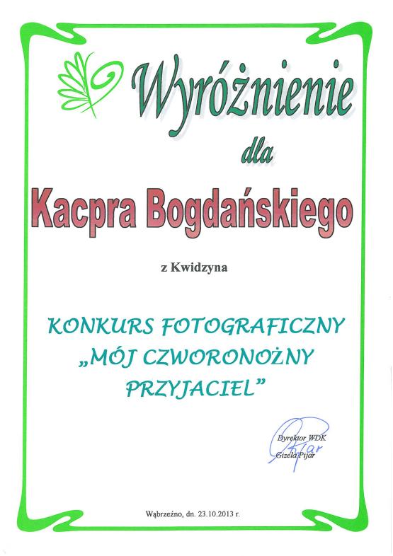 Dnia 23 października 2013 r. w Wąbrzeskim Domu Kultury odbyło się uroczyste rozstrzygnięcie Wojewódzkiego Konkursu Fotograficznego „Mój czworonożny przyjaciel”. W zmaganiach konkursowych udział wzięło około 400 osób, które nadesłały łącznie ponad 550 prac przedstawiających ulubione zwierzątko. Na zdjęciach można było zobaczyć między innymi psy, koty, chomiki, konie oraz świnki morskie. Podczas wyboru prac jury zwracało uwagę przede wszystkim na oryginalność, pomysłowość, estetykę pracy, walory artystyczne oraz zabawne ujęcia zwierzaków. Miło nam poinformować, iż uczniowie naszego gimnazjum zdobyli wyróżnienie w tym konkursie. Są to: Arkadiusz Kannenberg z klasy II d - uczeń pani Bożeny Lemańskiej oraz Kacper Bogdański z klasy I f - uczeń pani Aleksandry Brejnakowskiej. |
