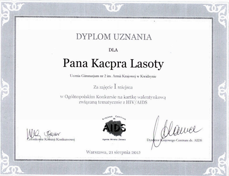 2 grudnia 2013r. w Gimnazjum nr 2 w Kwidzynie odbył się po raz jedenasty Wojewódzki Konkurs Wiedzy o AIDS i Wiedzy na temat uzależnień. W konkursie uczestniczyły szkoły gimnazjalne z całego województwa. Gościliśmy u siebie uczniów ze Szkoły Mistrzostwa Sportowego – Gimnazjum z Gdańska, Gimnazjum nr 50 z Gdańska oraz z Gimnazjum nr 3 z Malborka, a także wszystkie gimnazja z terenu miasta i gminy Kwidzyn. Uczniowie mieli do rozwiązania test wiedzy o HIV i AIDS a także musieli wykazać się wiedzą na temat narkotyków i uzależnień. Test został przygotowany przez panią Barbarę Osiecką z Terenowej Stacji Sanitarno – Epidemiologicznej w Kwidzynie. Najlepsze wyniki uczniów: