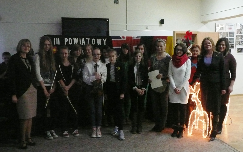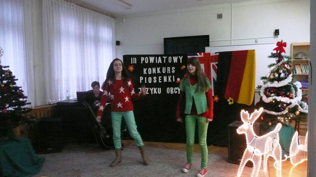 Już po raz trzeci Gimnazjum nr 2 im. Armii Krajowej w Kwidzynie zorganizowało "Powiatowy Konkurs Kolęd w Języku Obcym". Uczestnicy śpiewali w dwóch językach: angielskim i niemieckim. W konkursie udział wzięły szkoły: Gimnazjum Wandowo, Licze, Gimnazjum Społeczne z Kwidzyna oraz Gimnazjum nr 2. Zapowiadała i przedstawiała gości Hanna Hammermeister z kl. II j. W przerwach gości zabawiali kolędami granymi na flecie, gitarze oraz skrzypcach Roksana Kaczorowska oraz Kinga Dąbrowska z III h, Karol Nowicki z III i oraz Antonina Wierzba z kl. I c. Celem konkursu było zachęcenie uczestników do obcowania z kulturą krajów obcojęzycznych oraz poznawanie piękna języków obcych. Gratulujemy!! |