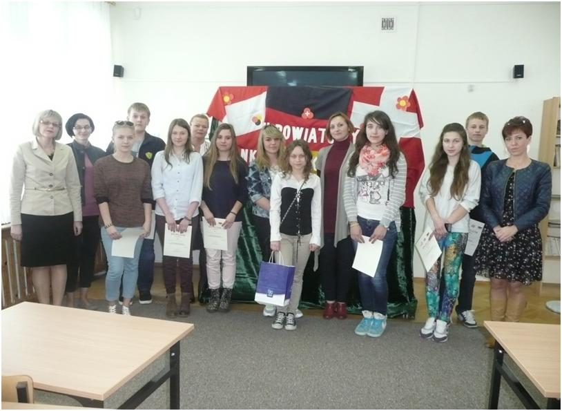 16 maja 2014 roku odbył się Powiatowy Konkurs Interdyscyplinarny zorganizowany przez Gimnazjum w Nowym Dworze oraz Gminny Ośrodek Kultury w Kwidzynie. Wzięły w nim udział 3-osobowe drużyny z pięciu szkół: Gimnazjum w Liczu, Gimnazjum w Sadlinkach, Gimnazjum w Ryjewie, Gimnazjum nr 2 w Kwidzynie oraz Gimnazjum w Nowym Dworze. Uczestnicy wykazywali się wiedzą z różnych dziedzin: historii Polski, geografii Polski, języka polskiego i wiedzy ogólnej. Ponadto rozwiązywali zadania wielotematyczne na tablicy multimedialnej z wykorzystaniem aplikacji learningapps. W konkursowych zmaganiach I miejsce zajęła drużyna z naszego gimnazjum. W jej składzie znaleźli się: Grzegorz Orlicki z klasy III i, Jędrzej Myrcha z klasy III i oraz Daria Furdal z klasy III g. Opiekunami uczniów są: pani Bożena Lemańska, pani Beata Kamińska, pani Gabriela Szwacka oraz pani Joanna Staszak. |