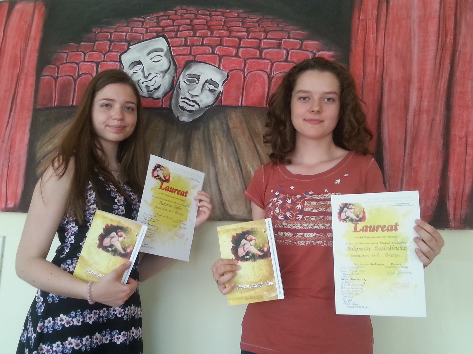 W styczniu 2014r. w Gimnazjum nr 2 w Słupsku odbył się XXX Międzynarodowy Konkurs Literackiej Twórczości Dzieci i Młodzieży Gimnazjalnej. Na konkurs nadesłano 6547 zestawów wierszy i opowiadań z 453 szkół podstawowych i gimnazjów z całej Polski, Stanów Zjednoczonych, Niemiec, Litwy i Turcji. Prace uczniowskie oceniało znakomite jury, w składzie którego przewodniczącą była pani Wanda Chotomska – znana i ulubiona poetka. Tytuł laureatki tego prestiżowego konkursu w kategorii proza otrzymały dwie gimnazjalistki z naszej szkoły - Małgorzata Duzinkiewicz z klasy 2g (uczennica pani Aleksandry Brejnakowskiej) oraz Zuzanna Gajko z klasy 3i (uczennica pani Bożeny Lemańskiej). Wyróżniono także pracę Sabiny Ściążko z klasy 3i(również uczennicę pani Bożeny Lemańskiej). Nagrodzone i wyróżnione utwory literackie zostały opublikowane w książce pokonkursowej „Piórem poznaję siebie” i będą wręczone młodym literatom podczas uroczystej gali 19 maja 2014 r. w Polskiej Filharmonii Sinfonia Baltica w Słupsku.