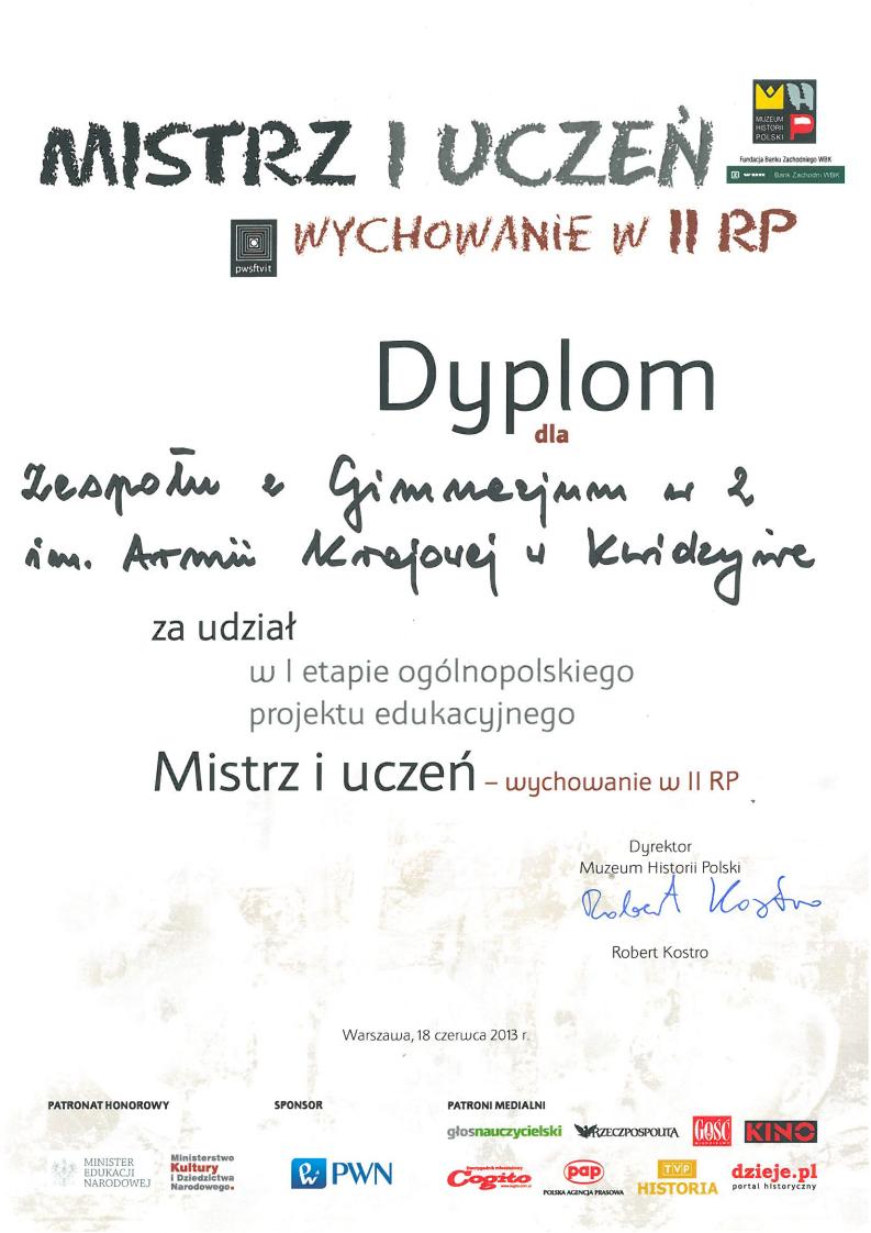 9 maja 2014 roku z okazji 20 lat istnienia Szkoły Podstawowej im. Armii Krajowej w Ostródzie, reprezentacja naszej szkoły: Michał Bakierski, Angelika Bereza, Sonia Floryańska, Zuzanna Lewandowska, Kamila Namiak, Marta Przysowa, Filip Sitarz, Tomasz Steingraber, Milena Szymańska, Antonina Wierzba, Andżelika Witusińska, Oliwia Wnuk z Panią Dyrektor Małgorzatą Wróblewską oraz nauczycielami: Renatą Bielawską-Kapicą, Jolantą Lewandowską i Sylwią Wardaszką, wzięła udział w uroczystych obchodach jubileuszu placówki.
