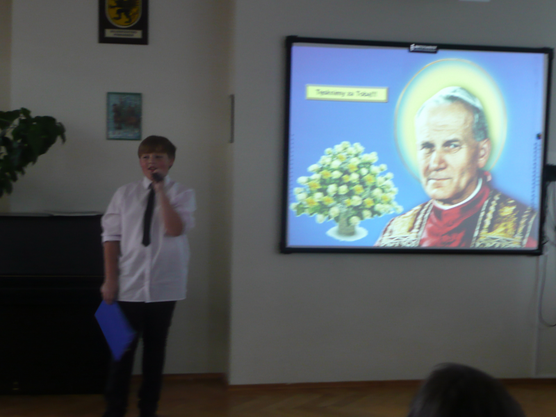 Papież Polak! Gdy Karol Wojtyła opuszczał Kraków, by udać się na konklawe do Rzymu, nikt nie przypuszczał, że zostanie w nim jako Jan Paweł II. Był jednym z najmłodszych dostojników Kościoła, mało znanym na świecie. A jednak to jego 111 kardynałów wybrało na następcę świętego Piotra. Dlaczego? Karol Wojtyła nie był zwykłym biskupem – wielokrotnie to udowodnił. Jak nikt inny rozumiał czasy, w których żył, był też zahartowanym w bojach z komunistami obrońcą Kościoła. Taki papież rodzi się raz na 1000 lat. W tym roku obchodzimy 35. rocznicę wyboru Karola Wojtyły na PAPIEŻA. Z tej okazji uczniowie naszej szkoły, przygotowani pod kierunkiem p. Ewy Zarębskiej i p. Ani Gnutek, zaprezentowali społeczności szkolnej montaż słowno- muzyczny, w którym nawiązali do pontyfikatu Jana Pawła II. Uczniowie biorący udział w montażu to: Julia Balsam, Oskar Borkowski, Julia Budek, Maciej Duszyński, Dominika Karauda, Magdalena Maślach, Szymon Tarasiński, Andżelika Witusińska z kl. Ig; Weronika Ćwiklińska, Jakub Jaranowski, Ewelina Pudlis, Ola Rejkiewicz, Ola Sosnowska, Filip Sitarz z kl. I i oraz Kamila Namiak z kl.II b.