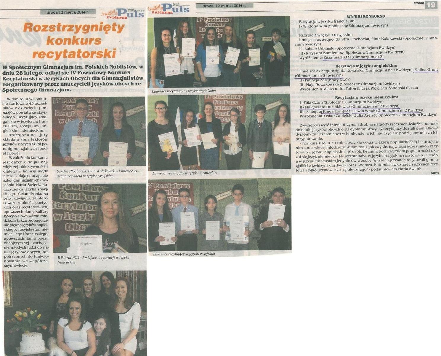 12 kwietnia 2014 r. odbył się XXXVI Miejski oraz VIII Powiatowy Konkurs Recytatorski pod hasłem: „Proza i poezja światowa”. Uczniowie naszej szkoły pięknie się zaprezentowali, zajmując następujące miejsca: Paweł Łożuk (uczeń p. Elżbiety Kanieckiej) - II miejsce; GRATULUJEMY!!! |