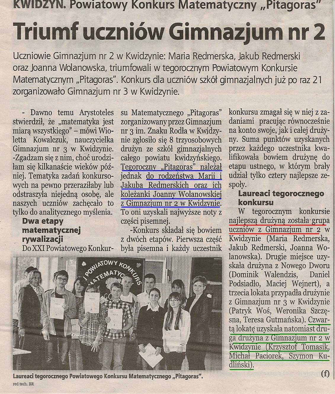 Dnia 12 kwietnia 2014 r. w Gimnazjum nr 3 w Kwidzynie, odbył się XIII Powiatowy Konkurs Matematyczny dla klas pierwszych gimnazjum „Liczby na co dzień”. Gimnazjum nr 2 reprezentowały uczennice klasy 1c: Michlewicz Agnieszka, Łąpieś Kinga i Wierzba Antonina, które uzyskały najwyższe wyniki w konkursie szkolnym. W etapie powiatowym uczennica Agnieszka Michlewicz zajęła I miejsce. |