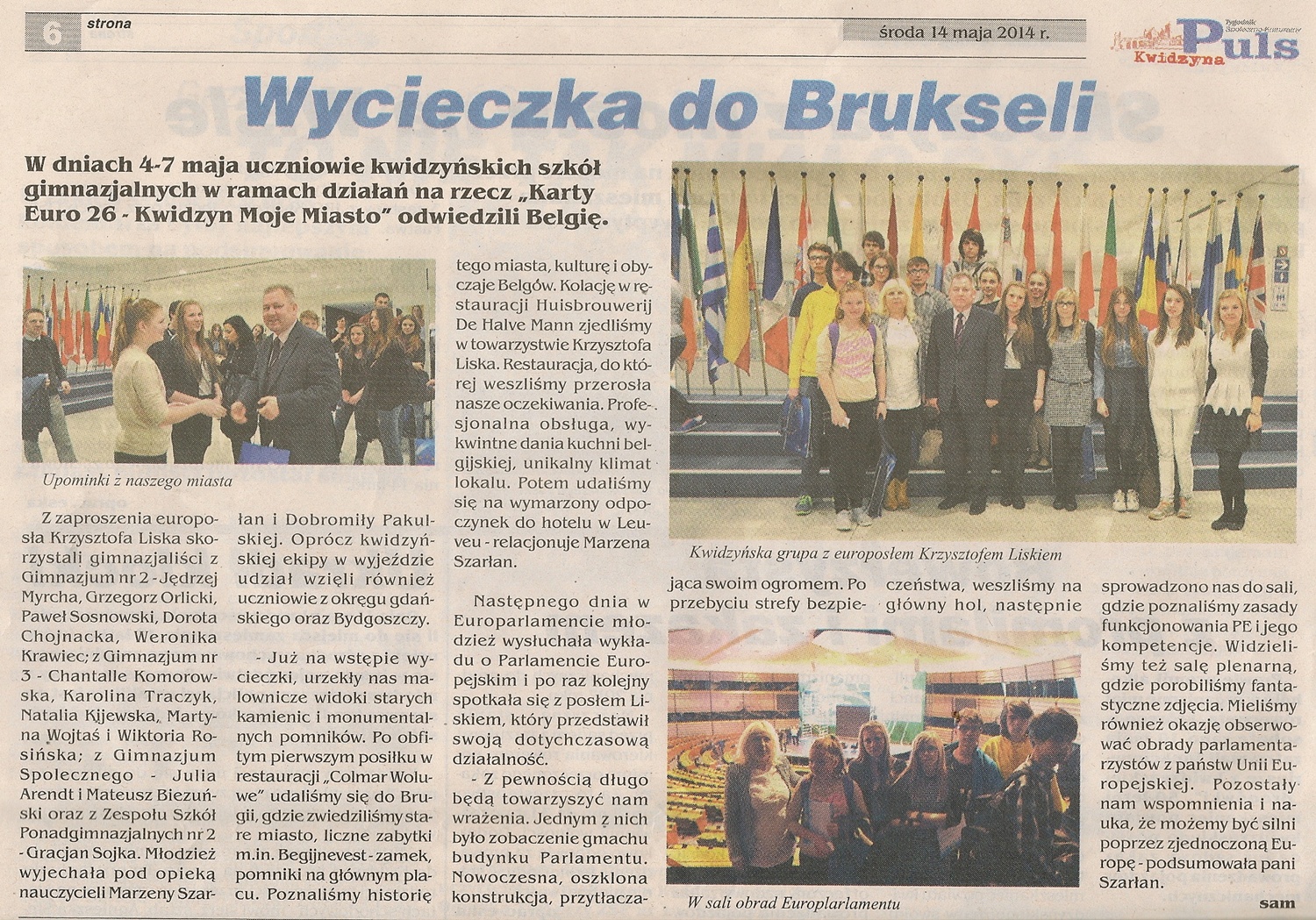 W dniach 4-7.05.2014 r. pięciu uczniów naszej szkoły: Weronika Krawiec z klasy 3D; Paweł Sosnowski z klasy 3F; Dorota Chojnacka, Jędrzej Myrcha i Grzegorz Orlicki z klasy 3I uczestniczyło w wycieczce do Brukseli na zaproszenie europosła Krzysztofa Liska. Wiadomość o wyjeździe była wielką niespodzianką i wyróżnieniem dla młodzieży, która w bieżącym roku szkolnym odniosła ogromne sukcesy w nauce i na Kartach Euro zgromadziła największą ilość punktów. Podczas kilkudniowej wycieczki młodzież poznawała historię miasta, kulturę i obyczaje Belgów, podziwiała zabytki Brugii, zwiedziła Brukselę. Podczas zwiedzania Parlamentu Europejskiego młodzież wysłuchała wykładu o Parlamencie Europejskim, zapoznała się z kompetencjami, zasadami jego funkcjonowania oraz spotkała z europosłem Krzysztofem Liskiem, który opowiedział o swojej dotychczasowej działalności w Unii Europejskiej. |