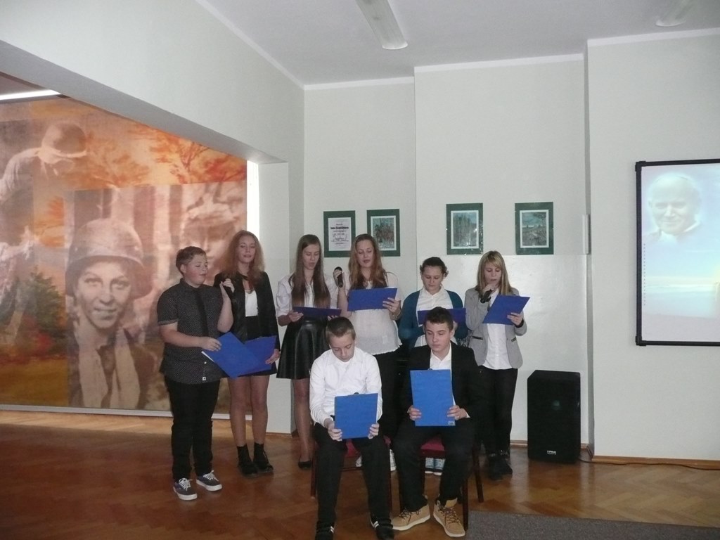 W tym roku w całej Polsce już po raz czternasty obchodziliśmy Dzień Papieski - jego hasło to "Jan Paweł II - świętymi bądźcie". Głównym celem jest przybliżanie postaci i nauczania Jana Pawła II oraz zbiórka pieniędzy na stypendia dla utalentowanej młodzieży z ubogich terenów wiejskich i małych miast. Natomiast w naszej szkole z tej okazji odbył się montaż słowno- muzyczny. P. Ewa Zarębska i p. Ania Gnutek kolejny już raz przygotowały młodzież do wzruszającego występu, w którym nie brakowało treści płynących z mądrości samego Karola Wojtyły.