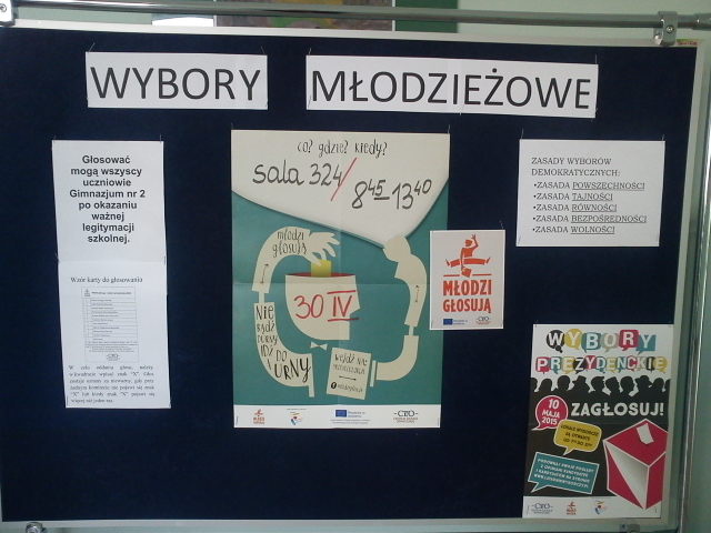 Uczniowie Gimnazjum nr 2 im. A.K. w Kwidzynie przystąpili do programu „Młodzi głosują” zorganizowanych przez CEO, a koordynowanego przez nauczyciela WOS p. Katarzynę Janicką. Wyników prawyborów przesłanych do CEO. Liczba uprawnionych do głosowania 674