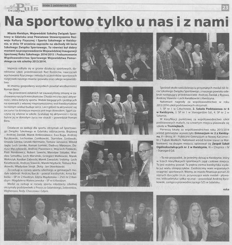 19 września 2014 roku w Teatrze Miejskim w Kwidzynie odbyła się doniosła uroczystość Obchodów 60-lecia Szkolnego Związku Sportowego, Wojewódzkiej Inauguracji Sportowej Roku Szkolnego 2014/2015 oraz Podsumowania Współzawodnictwa Sportowego Województwa Pomorskiego za rok szkolny 2013/2014. Po otwarciu imprezy, przemówieniach gości oraz wręczeniu odznaczeń i wyróżnień za wybitne zasługi dla sportu przyszedł czas na podsumowanie ubiegłego roku sportowego. Ogłoszono wyniki rywalizacji na wszystkich szczeblach edukacyjnych, a najlepsze reprezentacje otrzymały dyplomy i nagrody. Na deskach teatru spotkali się najlepsi spośród najlepszych. Bezkonkurencyjni wśród szkół gimnazjalnych okazali się młodzi sportowcy z Gimnazjum nr 2. To dla nas ogromna radość, bowiem nasze gimnazjum po raz drugi z rzędu zajęło I miejsce w województwie pomorskim w tej kategorii. Wojewódzką uroczystość uświetniło przedstawienie nawiązujące do idei olimpijskich przygotowane przez grupę teatralną naszej szkoły pod kierunkiem pani Bożeny Lemańskiej. Dokonania naszych sportowców były dowodem na to, że owe idee olimpijskie wciąż nie straciły na wartości. |