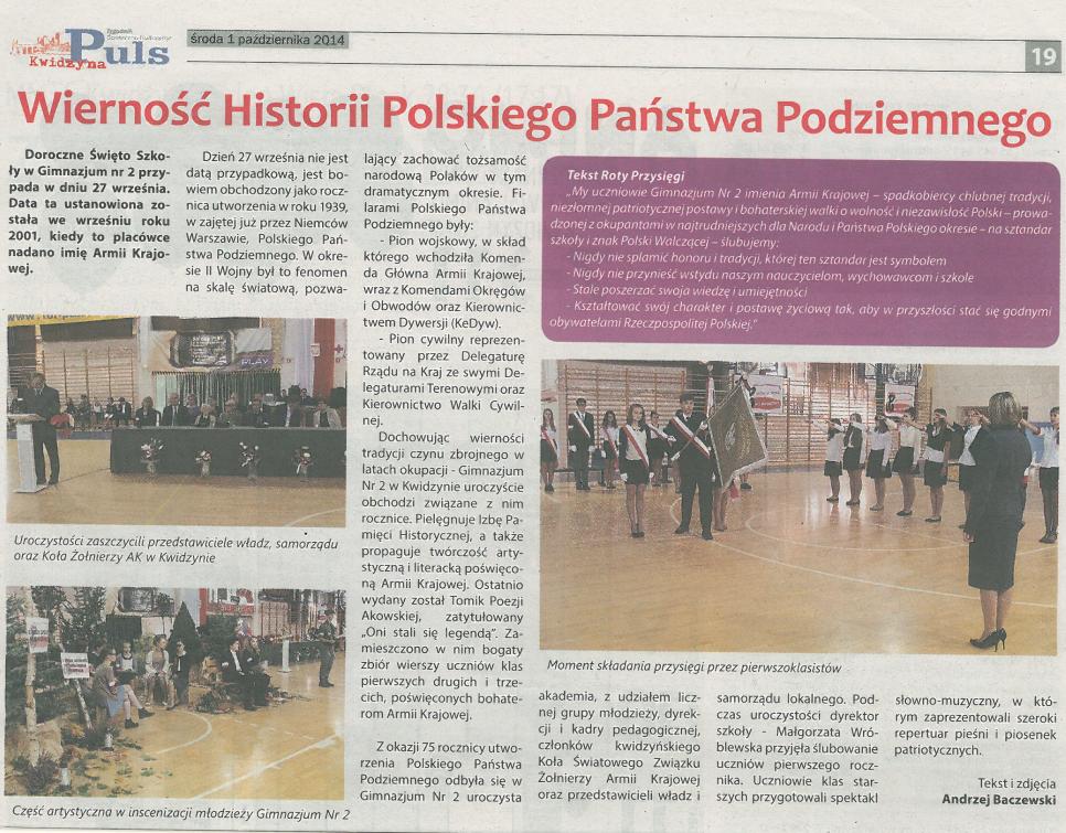 27 września 2014 roku obchodziliśmy uroczystość 75. rocznicy powstania Polskiego Państwa Podziemnego oraz 13. rocznicę nadania imienia Armii Krajowej naszej szkole. Na uroczystość przybyli znamienici goście, m.in. Senator Rzeczypospolitej Polskiej - pan Leszek Czarnobaj, Zastępca Burmistrza ds. Społecznych - pan Roman Bera, Zastępca Przewodniczącego Rady Miasta – pan Marian Frankowski, Przewodniczący Rady Rodziców Gimnazjum nr 2 – pan Marek Konieczek oraz goście honorowi- przedstawiciele Światowego Związku Żołnierzy AK, wśród których szczególnie gorąco witaliśmy Prezesa Światowego Związku Żołnierzy AK- Koło Kwidzyn- pana Stanisława Sklepowicza oraz Żołnierzy Armii Krajowej-panią Stefanię Pawłowską, pana Jana Paśko i pana Benedykta Mikołajczyka. Po odśpiewaniu hymnu, głos zabrała pani Małgorzata Wróblewska- dyrektor szkoły - przemawiała do całej społeczności zgromadzonej w hali, ale szczególne słowa uznania i zapewnienia skierowała do Żołnierzy Armii Krajowej, a następnie w obecności wszystkich gości przyjęła uroczyste ślubowanie uczniów klas pierwszych. Kolejnym punktem uroczystości był niezwykle wzruszający montaż słowno- muzyczny w wykonaniu młodzieży przygotowanej pod kierunkiem pani Grażyny Marek-Borowskiej i pani Aliny Tyszkowskiej, nad oprawą muzyczną natomiast czuwał pan Eligiusz Gełdon. Po montażu zaproszeni goście udali się do Izby Pamięci, a młodzież szkolna uczestniczyła w lekcjach wychowawczych poświęconych Armii Krajowej. |