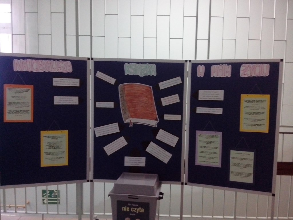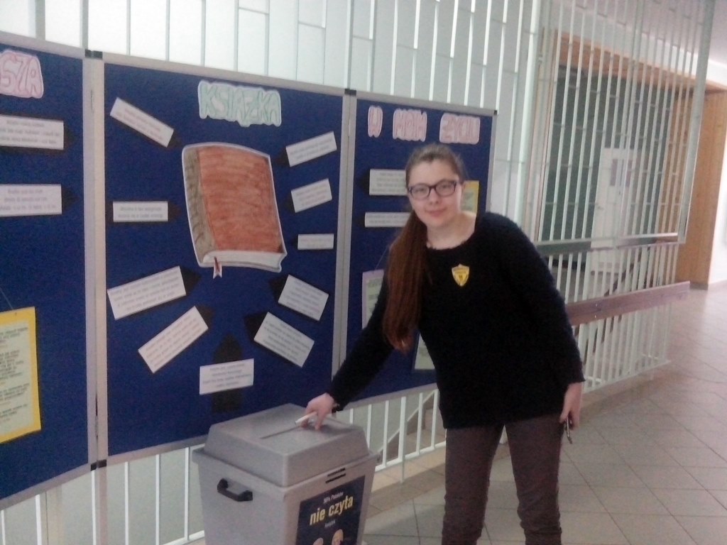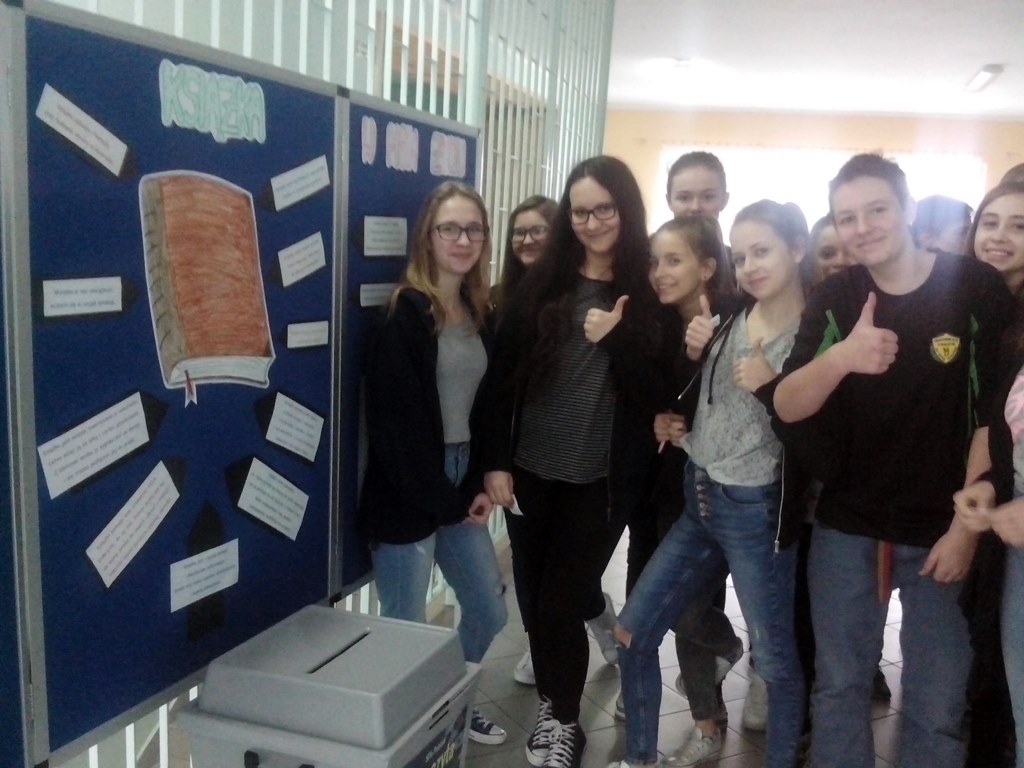 W czerwcu odbyło się podsumowanie projektu „Fotograficzne wariacje na temat książki”. Celem projektu była: • popularyzacja czytelnictwa i biblioteki szkolnej w nowoczesny, modny i zabawny sposób, • zainteresowanie uczniów grafiką książki, czasopisma, • rozwijanie wyobraźni i kreatywności w łączeniu okładki książki z obrazem, • doskonalenie umiejętności posługiwania się aparatem fotograficznym. W projekt byli zaangażowani uczniowie klas I i II: Maciej Banach kl. II b, Katarzyna Chłopska kl. II f, Kamila Łukasiewicz kl. II f, Zuzanna Rawicz-Galińska kl. I g, Martyna Soliwoda kl. I d, Karolina Waga kl. I d, Martyna Zagańczak kl. I d. Uczniowie przez dwa miesiące przygotowywali zdjęcia, w których okładka książki stanowiła spójny element z tłem. A oto wyniki ich pracy: >>>>>>