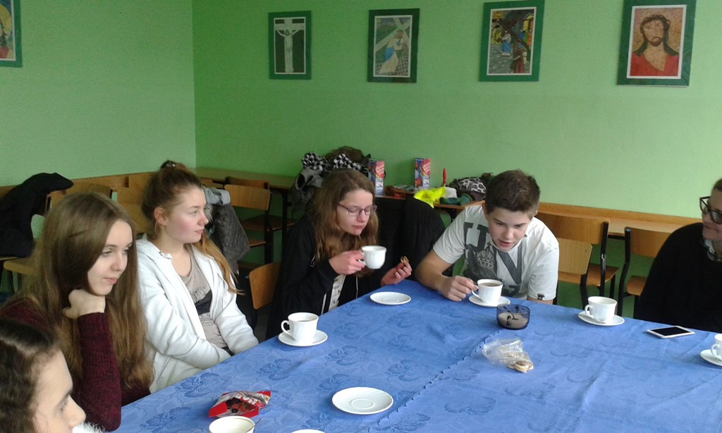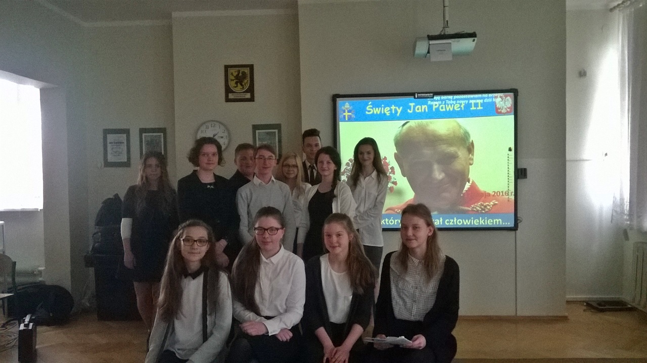 Zgromadzeni w 1978 roku na Placu Świętego Piotra ludzie wołali: „ Nie znamy go. Nic o nim nie wiemy.” Dziś, po kanonizacji Jana Pawła II, świat z pewnością wie, że był to człowiek wielkiego ducha, wielki przywódca, przyciągający do siebie miliony ludzi różnych narodowości i ras, dawał pociechę ludziom schorowanym, samotnym, mobilizował do aktywności młodzież. To człowiek dialogu. To tylko niektóre słowa, jakie mogła usłyszeć młodzież uczestnicząca w montażu słowno- muzycznym, który przybrał formę magazynu telewizyjnego, a poświęcony był właśnie Janowi Pawłowi II. Filip Sitarz z kl. III i, jako gospodarz programu, prowadził rozmowy z przyjaciółmi Karola Wojtyły z czasów młodości. W role przyjaciół młodego Wojtyły wcielili się: Tomek Steingraber, Weronika Mazurek oraz Michał Bakierski z kl. III d. Utwory wokalne zaprezentowali Andżelika Witusińska z III g i Kuba Jaranowski z III i. Nad przygotowaniem młodzieży do występu czuwały panie: Ewa Zarębska (która dodatkowo wzbogaciła montaż o prezentację multimedialną) i Anna Gnutek.
