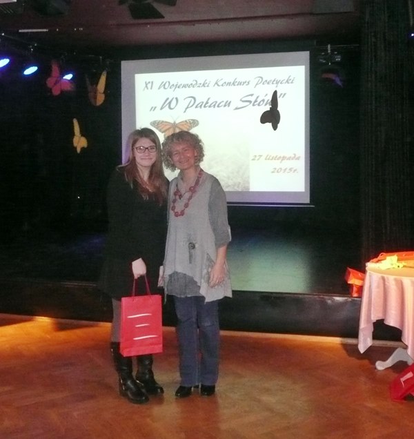 27 listopada 2015r. w Pałacu Młodzieży w Gdańsku odbyła się uroczysta gala rozdania nagród w XI Wojewódzkim Konkursie Poetyckim „W Pałacu Słów”. Na konkurs nadesłano łącznie 789 utworów, w tym 295 tekstów ze szkół gimnazjalnych. Jury w składzie: pani Barbara Piórkowska – pisarka, poetka, pani Marzena Wojciechowska – Orszulak – polonistka, teatrolog oraz pan Tomisław Ryczko – aktor oceniło prace i przyznało nagrody. I miejsce w tej kategorii zajęła uczennica klasy 3f Julia Rybicka. Przewodnicząca jury nie szczędziła słów zachwytu na temat oryginalności poezji uczennicy, doceniono temat, kompozycję, realizację oraz bogactwo środków artystycznego wyrazu. Z przyjemnością się tego słuchało. |