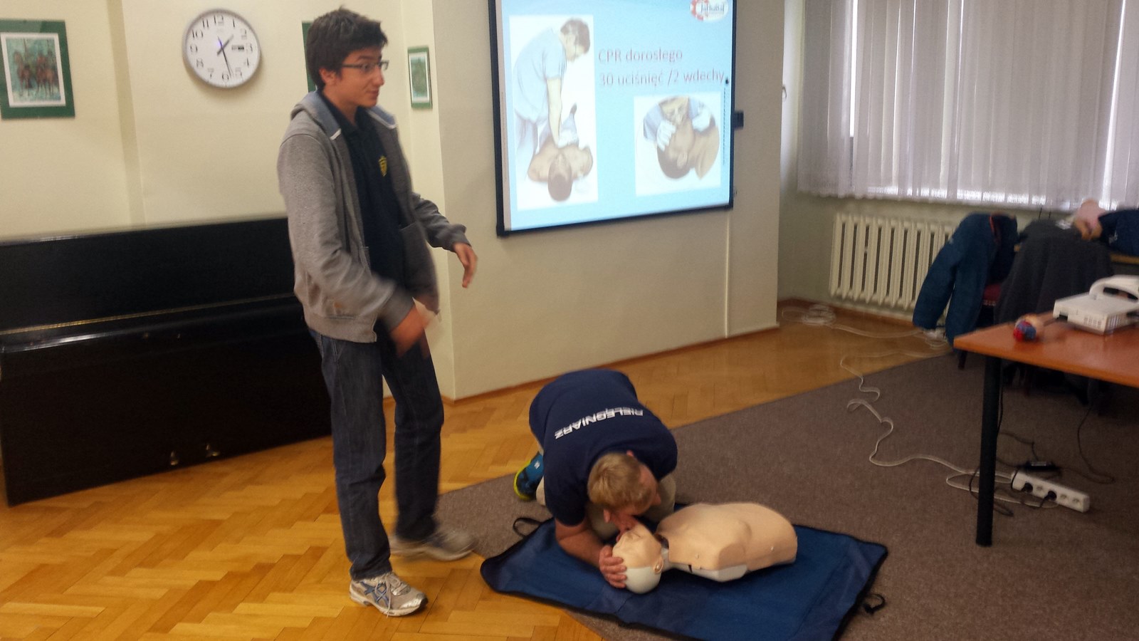 W dniach 13 i 27 kwietnia kolejna grupa naszych gimnazjalistów uczestniczyła w szkoleniu z zakresu pomocy przedmedycznej. Tym razem uczniowie klasy 2e i 2a uczestniczyli w pokazie multimedialnym, a podczas zajęć praktycznych, pod okiem wykwalifikowanego instruktora nabywali praktycznych umiejętności udzielenia pierwszej pomocy przedmedycznej. Uczestnikom szkolenia zostały zaprezentowane techniki rozpoznawania i postępowania w wybranych przypadkach nagłego zagrożenia życia i zdrowia, w tym techniki resustytacji krążeniowo-oddechowej oraz zasady i sposoby opatrywania różnego rodzaju ran i urazów. Zaprezentowano narzędzia do reagowania w bezpośrednim zagrożeniu życia oraz metody zminimalizowania stresu podczas udzielania pierwszej pomocy. Uczestnicy szkolenia zapoznali się z podstawowym wyposażeniem apteczki ratunkowej. Mieli również okazję w części praktycznej wykonywać ćwiczenia masażu serca z użyciem manekina - fantoma. Prowadzący szkolenie szczególną uwagę poświęcił zagadnieniu prawidłowego powiadamiania służb ratunkowych. Wartym podkreślenia jest fakt, iż tego typu szkolenie odbyło się już po raz trzeci w tym roku szkolnym i jest efektem współpracy Dyrekcji szkoły z rodzicami, którzy byli inicjatorami i współorganizatorami wspomnianego cyklu szkoleń.