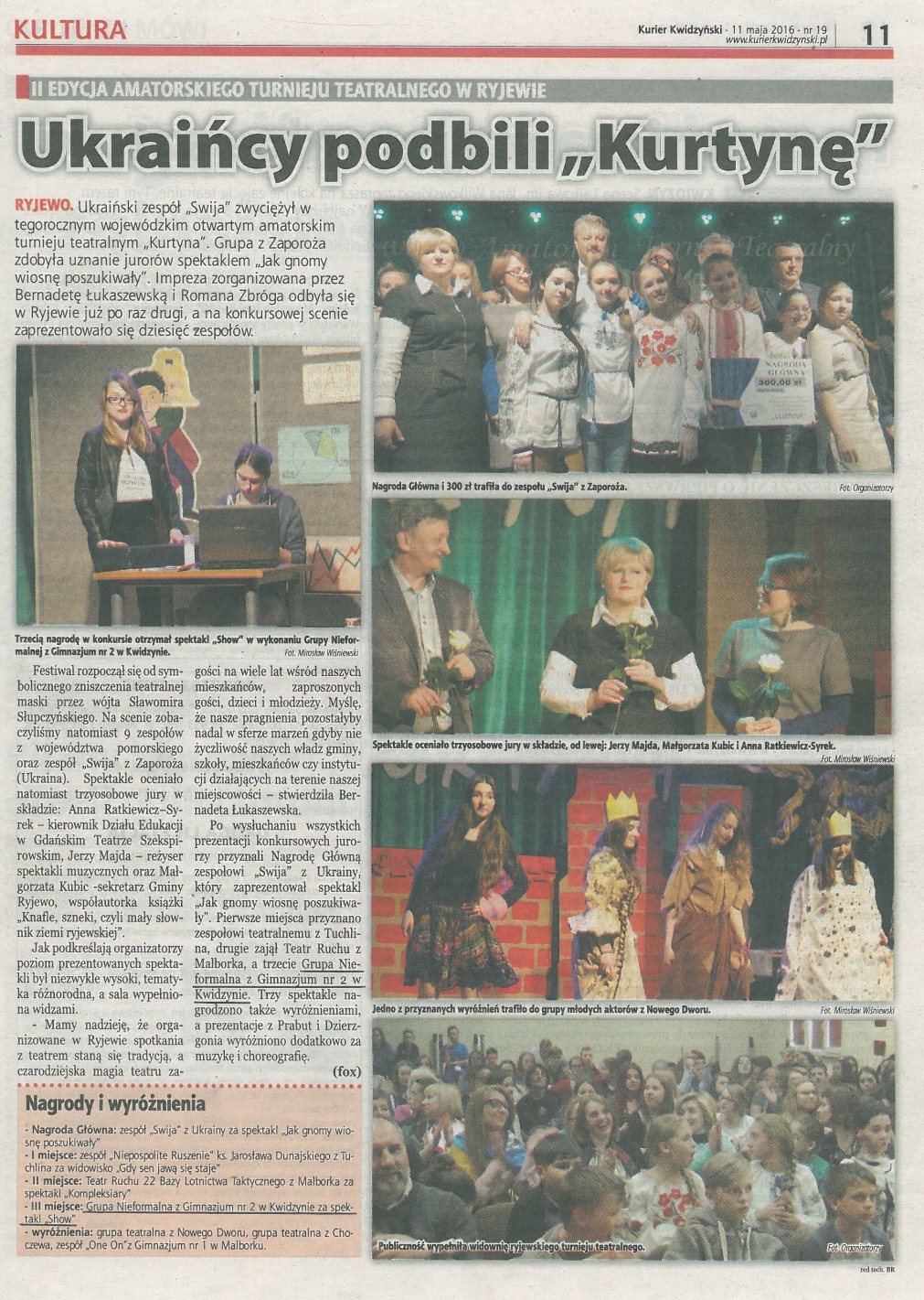 14 czerwca 2016 r. w kwidzyńskim teatrze odbyła się UROCZYSTA GALA będąca podsumowaniem VI Turnieju Zdarzeń Artystycznych "SZKOŁA Z TALENTEM". Autorem i realizatorem tego proje A oto laureaci turnieju i ich opiekunowie: I miejsce - Dominika Andrzejewska (opiekun pani Alina Tyszkowska) II miejsce - Filip Sitarz (opiekun pani Anna Ptak-Gnutek) II miejsce - Michał Bakierski (opiekun pani Grażyna Marek-Borowska) III miejsce - Andżelika Witusińska (opiekun pani Anna Ptak-Gnutek) wyróżnienie - Wiktoria Kobus (opiekun pani Bożena Lemańska) wyróżnienie - Marta Greglewska (opiekun pani Aleksandra Brejnakowska) Konkurs filmowy: II miejsce - Julianna Kubiak (opiekun pani Anna Ptak-Gnutek) III miejsce - Dominika Andrzejewska (opiekun pani Alina Tyszkowska) Festiwal piosenki: wyróżnienie - Julia Wikierska (opiekun pani Bożena Lemańska) Serdecznie gratulujemy wszystkim zwycięzcom!!! |