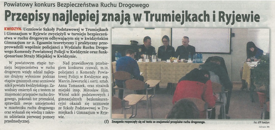 Dnia 28 kwietnia 2016r. odbył się w naszej szkole etap powiatowy Turnieju Bezpieczeństwa w Ruchu Drogowym. Do turnieju przystąpiły drużyny wyłonione w etapach miejskich i gminnych szkół podstawowych (SP6 Kwidzyn, SP Trumiejki, SP Tychnowy, ZS Nebrowo Wielkie, SP Cygany, SP Straszewo) i gimnazjów (Gim Rodowa, ZS Nebrowo Wielkie, Gim Nowy Dwór, Gim Gardeja, Gim Ryjewo, Gim 2 Kwidzyn). Młodzież zmagała się z przepisami - rozwiązując test, test ze skrzyżowaniami, z jazdą po torze przeszkód i w miasteczku oraz udzielaniem pierwszej pomocy w przypadku RKO. Nad prawidłowym przebiegiem turnieju czuwali funkcjonariusze POLICJI i STRAŻY MIEJSKIEJ, pielęgniarka oraz nauczyciele. Do następnego etapu, czyli do województwa, zakwalifikowali się uczniowie ze Szkoły Podstawowej w Trumiejkach oraz młodzież z Gimnazjum w Ryjewie. Drużyna z naszego gimnazjum zajęła II miejsce.