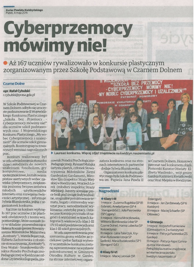 Dnia 21 kwietnia 2016 r. w Szkole Podstawowej w Czarnem Dolnem odbyło się uroczyste podsumowanie I Wojewódzkiego Konkursu Plastycznego "MY wobec Cyberprzemocy i uzależnień!”. Honorowy patronat nad konkursem objęli: Pani Elżbieta Wasilenko - Pomorski Kurator Oświaty, Pan Kazimierz Kwiatkowski - Wójt Gminy Gardeja oraz Straż Miejska w Kwidzynie. Konkurs realizowany jest w celu uświadomienia stosunku dzieci młodzieży do nowych uzależnień: fonoholizm, gry komputerowe, media społecznościowe, kształtowania postaw asertywnych wobec zjawiska cyberprzemocy, zwiększenia poziomu bezpieczeństwa młodych użytkowników Internetu oraz rozwijania twórczości artystycznej.