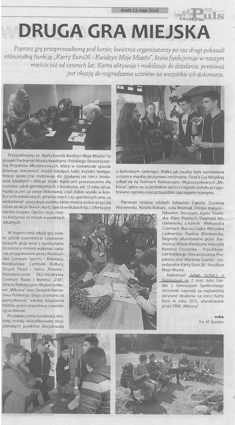 22 kwietnia w Kwidzynie odbyła się II Gra Miejska „Dookoła Kwidzyna z Kartą EURO26 Kwidzyn Moje Miasto”. Celem gry było: zachęcenie do korzystania z oferty kulturalnej, sportowej i naukowej Kwidzyna, zdobycie umiejętności pracy w grupie, pobudzenie do kreatywnego myślenia, nieszablonowego działania oraz aktywnej postawy na rzecz środowiska lokalnego. W grze brało udział 18 czteroosobowych zespołów. Wśród nich były też nasze dwie drużyny, które tworzyli pod opieką pań Agnieszki Matłosz i Sylwii Wardaszki: Maja Gnutek, Marta Tandecka, Julia Ślusarska, Julia Zalech z kl. III c oraz Aleksandra Kanigowska, Bader Barakat z kl. I i, Karolina Waga z kl. I d, Agnieszka Kwiecińska z kl. III h . Uczestnicy gry mieli do pokonania wyznaczoną trasę oraz wykonanie 6 zadań punktowanych w wyznaczonych punktach kontrolnych. Oceniana była: pomysłowość, kojarzenie faktów, wiedza, praca zespołowa i orientacja w terenie. Rywalizacja drużyn zakończyła się na Miłosnej wspólnym ogniskiem i wręczeniem nagród dla wszystkich uczestników gry. Julian Uchacz z kl. III f otrzymał nagrodę specjalną za najbardziej aktywne działania na rzecz Karty EURO.