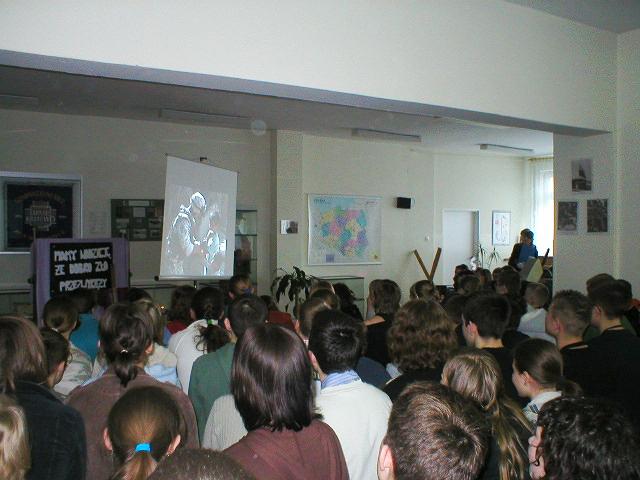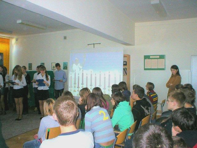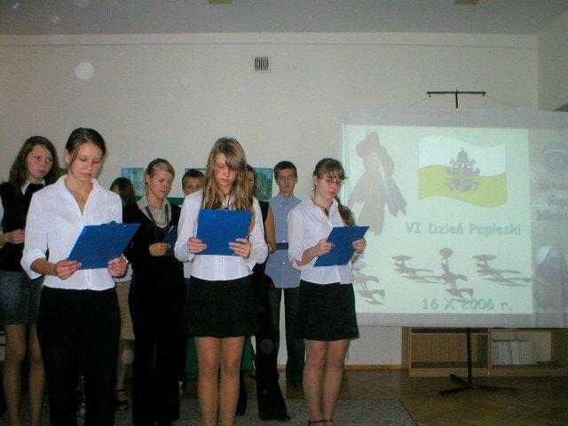 16 października 2006r. (w rocznicę wyboru Karola Wojtyły na PAPIEŻA) obchodziliśmy VI Dzień Papieski. Z tej okazji uczniowie klasy III f pod kierunkiem p. Ewy Zarębskiej i p. Anny Gnutek przygotowali montaż słowno-muzyczny, na który zostały zaproszone wszystkie klasy naszej szkoły. Aby umożliwić uczestnictwo w montażu wszystkim uczniom, klasa III f występowała w dniach 16 i 17 października.
