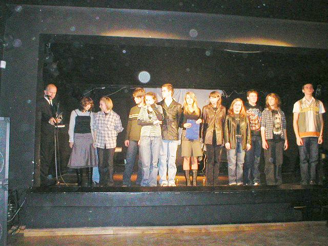 W dniach 4 XII – 8 XII 2006 odbyły się w naszym mieście XVI KWIDZYŃSKIE SPOTKANIA TEATRALNE „TEATRALIA”. W związku z remontem kinoteatru impreza ta miała miejsce w „Czarnej Sali” przy ul. Słowiańskiej. Nasze gimnazjum reprezentowały cztery zespoły. Jako pierwsza 7 grudnia wystąpiła „GRUPA NIEFORMALNA” z przedstawieniem „Narkotyki – nie biorę!” w reżyserii p. Renaty Kapicy i p. Renaty Radomskiej. Następnie zaprezentowała się „DZIEWIĄTKA” z „Hamletem według Szekspira” w reżyserii p. Anny Templin, a po niej kabaret „INTELIGENTNI INACZEJ” z własną wersją znanych scenek kabaretowych „Przeżyjmy to jeszcze raz”, również wyreżyserowanych przez p. Annę Templin. 8 grudnia grupa „AKCENT” zaprezentowała „Dwie strony świata” – widowisko muzyczne przygotowane przez p. Bożenę Lemańską. Wszystkie przedstawienia zostały nagrodzone gromkimi brawami zgromadzonej publiczności, a młodzi „aktorzy” otrzymali pamiątkowe statuetki Pegaza. |