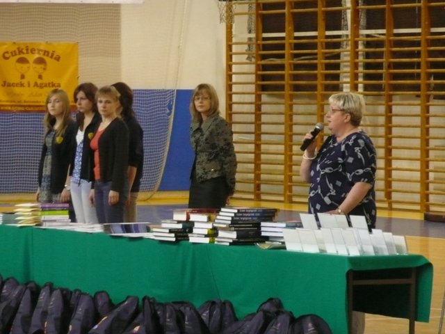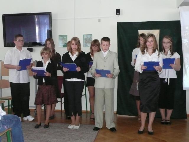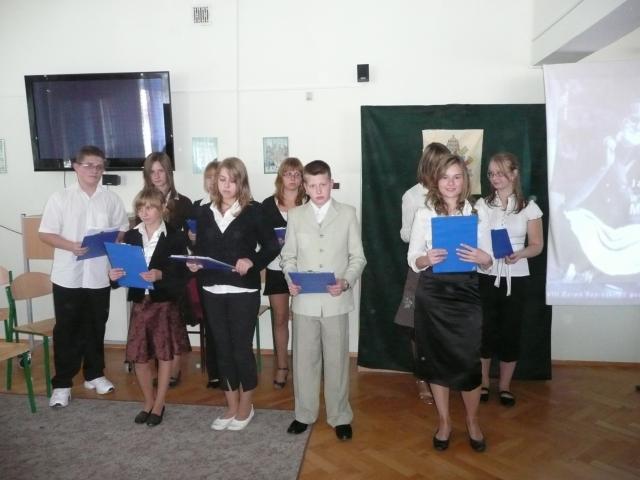 19 czerwca 2009r. o godz. 900 odbyła się uroczystość zakończenia kolejnego roku szkolnego. Pani Dyrektor gratulowała uczniom osiągnięć i życzyła udanych wakacji. Do życzeń przyłączył się Burmistrz oraz Przewodniczący Rady Rodziców. Następnie zostały wręczone nagrody laureatom i finalistom konkursów, Statuetki Złotej Sowy najlepszym gimnazjalistom oraz nagrody wyróżnionym uczniom i podziękowania dla ich rodziców. Na koniec uroczystości został przekazany Sztandar Szkoły młodszym gimnazjalistom.