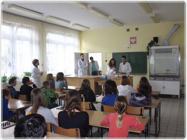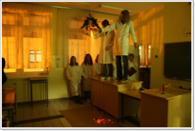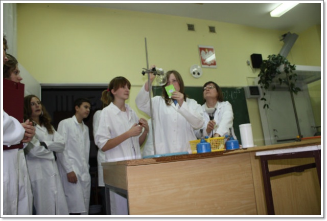 Dzień Mola: nie chodzi tu bynajmniej o „mola książkowego” czy, co gorsza, niszczącego nasze ubrania, ale o podstawową jednostkę liczności (ilości) materii w układzie SI. To nieoficjalne święto obchodzone przez chemików - zostało zapoczątkowane we wczesnych latach osiemdziesiątych przez amerykańskiego nauczyciela chemii: Marice Oehlera. Wiele szkół w USA i Kanadzie a ostatnio również w wielu krajach Europy obchodzi Dzień Mola 23 października pomiędzy godzinami 6.02 am i 6.02 pm Data i godziny odnoszą się do Liczby Avogadra. Celem tego święta jest zainteresowanie uczniów chemią.W związku z tym, że 23 października odbywał się w naszej szkole próbny egzamin gimnazjalny zmieniliśmy termin i pokazy z okazji Dnia Mola odbyły się 4 listopada 2008 r. Z zainteresowaniem obejrzeli je uczniowie naszego gimnazjum oraz zaproszeni goście.