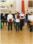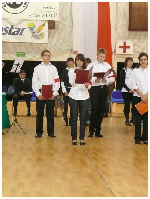 12 listopada w naszym gimnazjum odbył się uroczysty apel z okazji 90 rocznicy odzyskania przez Polskę niepodległości. W hali sportowej zgromadziła się cała społeczność szkolna oraz zaproszeni goście. W imieniu kombatantów Światowego Związku Żołnierzy Armii Krajowej wystąpił prezes oddziału w Kwidzynie p. Stanisław Sklepowicz. Podzielił się on swoimi wspomnieniami dotyczącymi walki o wolną Ojczyznę, a następnie przekazał przedstawicielom Samorządu Uczniowskiego Krzyż Armii Krajowej. Wzbogaci on eksponaty zgromadzone w Izbie Pamięci. Ta uroczystość szkolna była również okazją do wyróżnienia ucznia klasy III D Pawła Jaworskiego, który podczas wakacji wykazał się niezwykłą odwagą, udzielając pomocy tonącemu mężczyźnie. Po zakończeniu części oficjalnej wszyscy obecni na uroczystości obejrzeli montaż słowno muzyczny „O niepodległość, całość i wolność Ojczyzny naszej”.