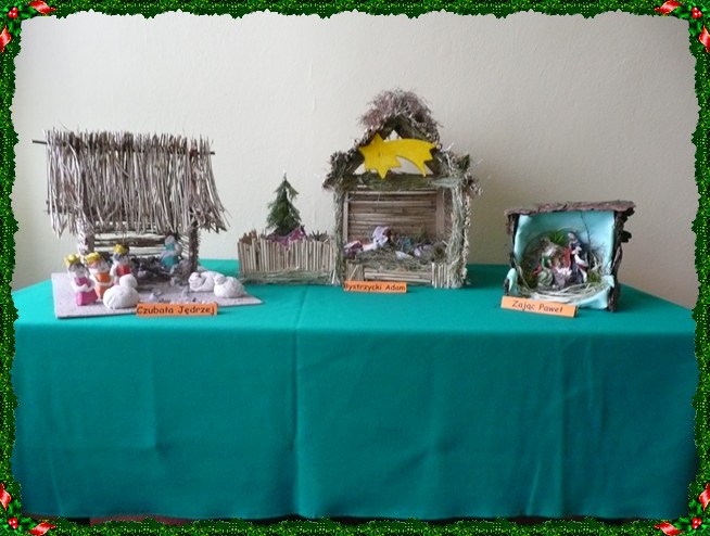 - Według tradycji pierwszą szopkę bożonarodzeniową zbudował św. Franciszek z Asyżu. Była ona w wystroju leśnym, a w niej Święta Rodzina i żywe zwierzęta. Uczniowie naszej szkoły przygotowali makiety przedstawiające wnętrze stajni betlejemskiej w noc, podczas której narodził się Jezus Chrystus. Najpiękniejsze szopki wykonali Adam Bystrzycki, Jędrzej Czubała i Paweł Zając.